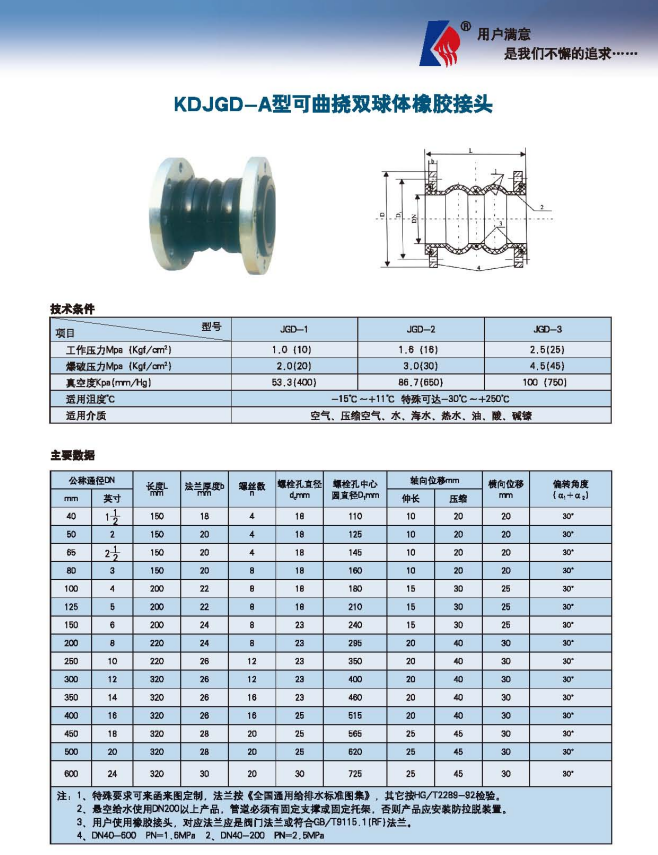 产品用途根据介质不同所采用的橡胶材质也不同,有天然胶、丁苯胶、丁基胶、丁腈胶、三元乙丙胶、氯丁胶、硅橡胶、氟橡胶等等。分别具有耐热、耐酸、碱、耐腐蚀、耐磨、耐油等功能。技术参数